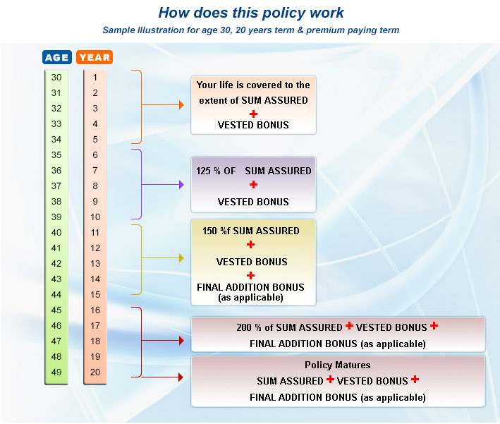 Maturity Benefit - At the end of policy term policyholder will get Basic Sum Assured with Total vested reversionary bonus and Final Additional Bonus (as applicable)